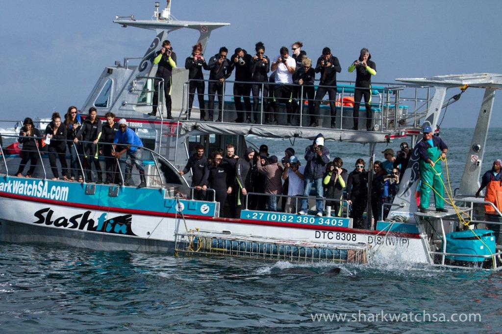 Contrary to popular belief, shark cage diving does not habituate sharks to boats. These highly intelligent and inquisitive creatures just love to suss out anything, including boats. They come up close and personal for the ultimate adrenalin rush. They hang around for maybe 10-15 minutes before moving on. And the waiting game resumes.