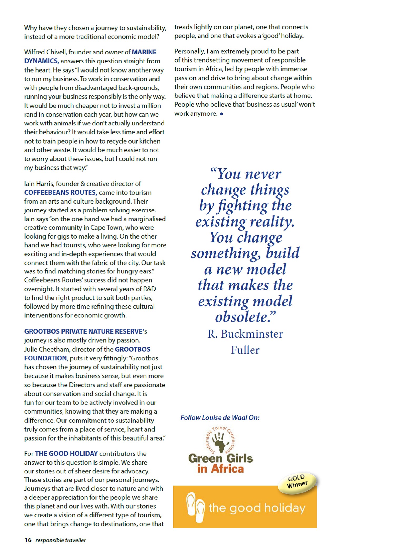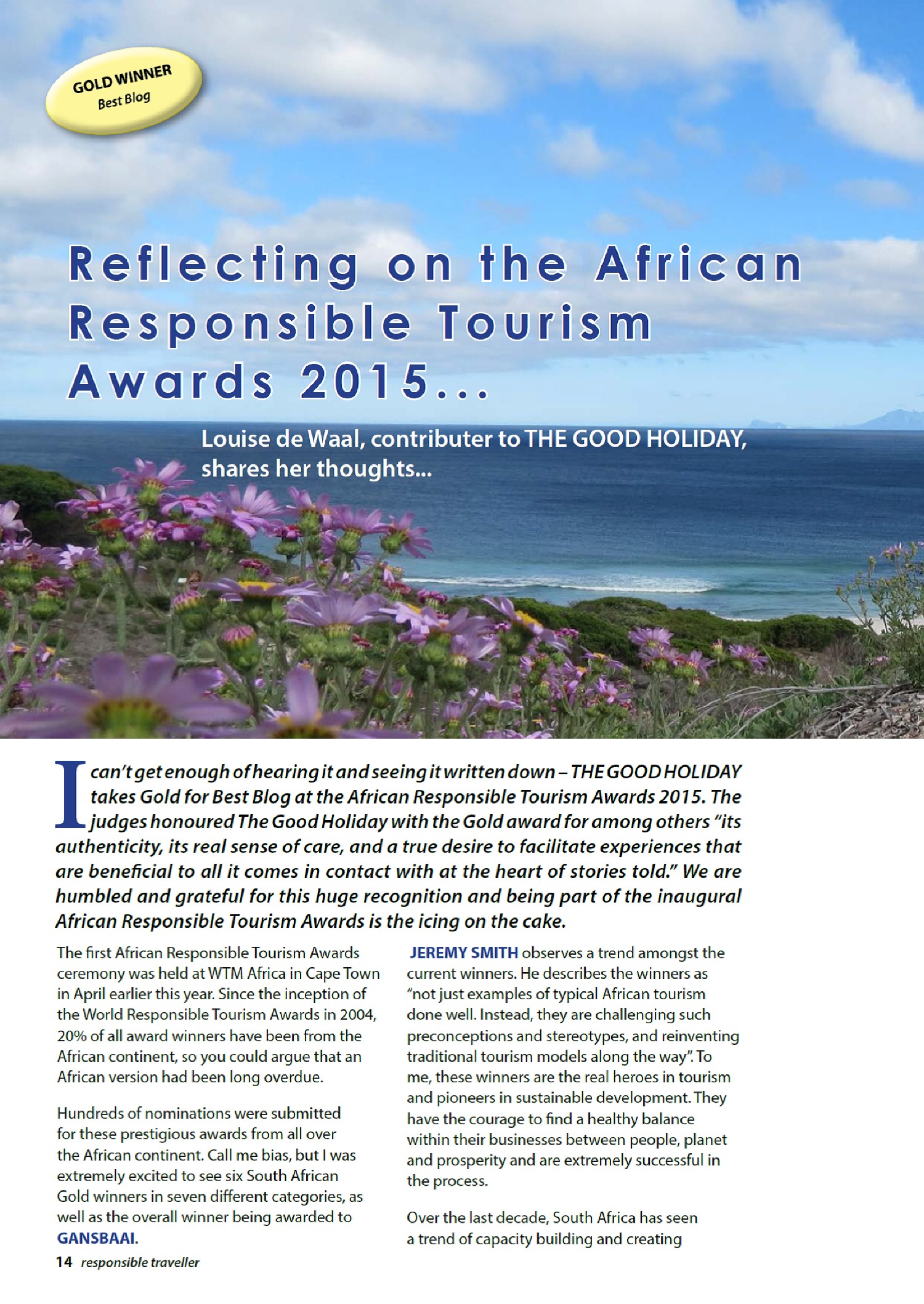 Reflecting on the African Responsible Tourism Awards 2015 was first published in the Responsible Traveller Magazine (issue April-May 2015, page 14-16). This story can also be read as a PDF link.