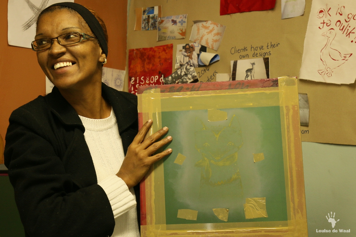 Fahema Zlomke showing some silkscreen printing by Prints in the Breytenbach Sentrum, Wellington.