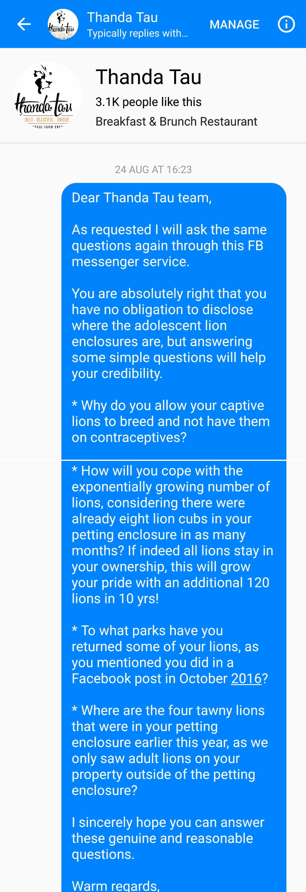 Thanda Tau DM communication 1 Posted on December 26, 2017 by Dr Louise de Waal Leave a comment Next Return to From stony silence to anger – the response to online critical voices