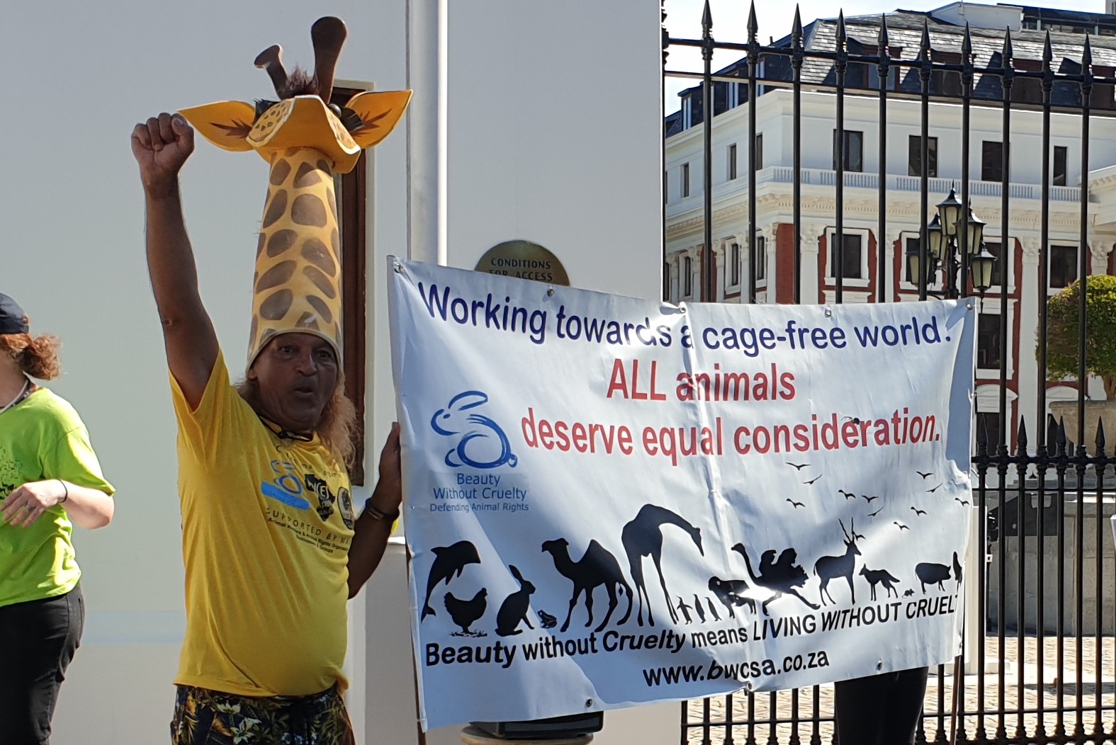 After a short march from Darling Street to Parliament, Toni Brockhoven from Beauty without Cruelty presented a petition to His Excellency, Prince Mangosuthu Buthelezi, MP Inkatha Freedom Party (IFP). He made a promise to bring the petition to the attention of the Speaker of the National Assembly and the Ministers of Agriculture, Forestry and Fisheries, Tourism, and Environmental Affairs.