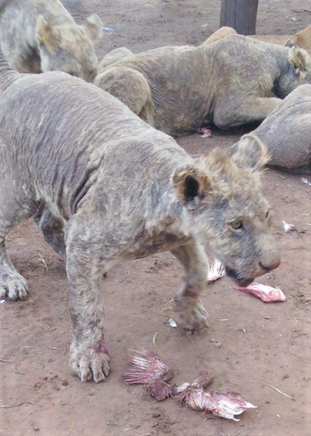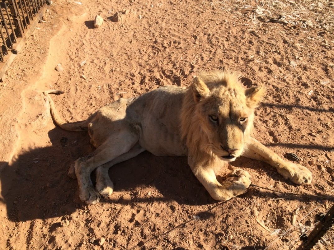Inspectors of the National Council of SPCAs (NSPCA) found 27 lions with severe mange, two lion cubs unable to walk, obese caracal unable to groom themselves, overcrowded and filthy enclosures, inadequate shelter, lack of water, and parasitic conditions.