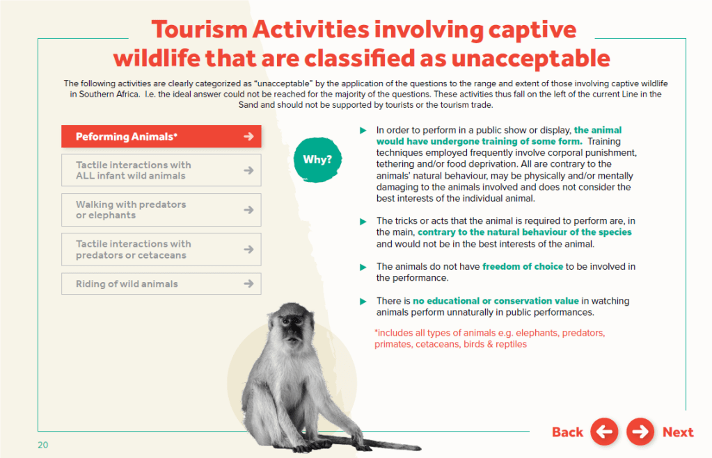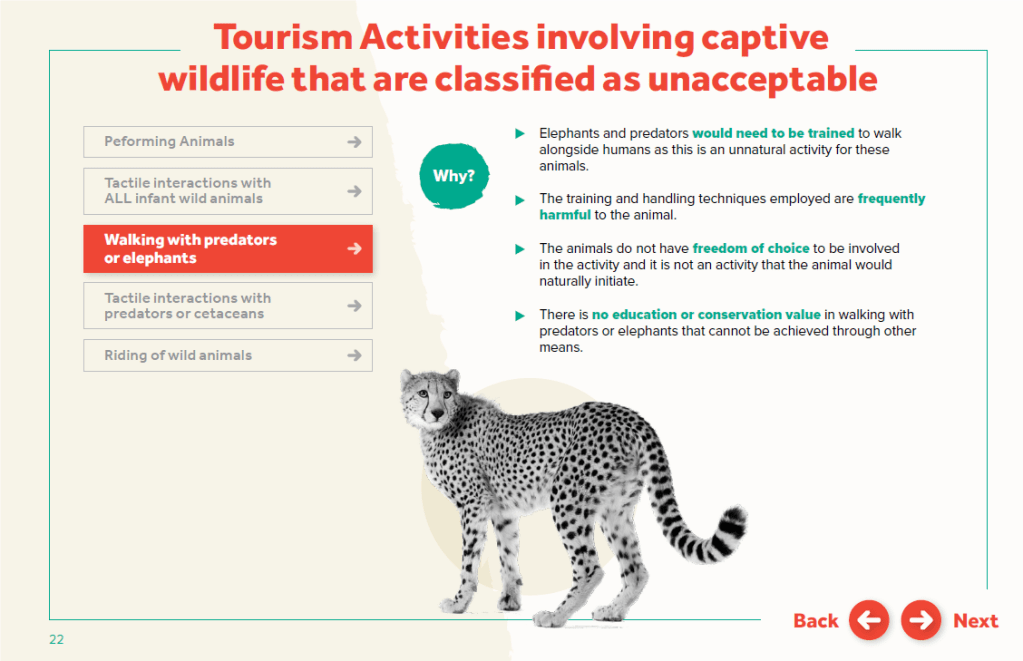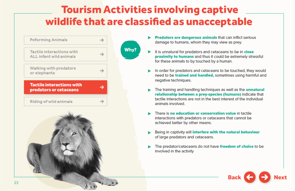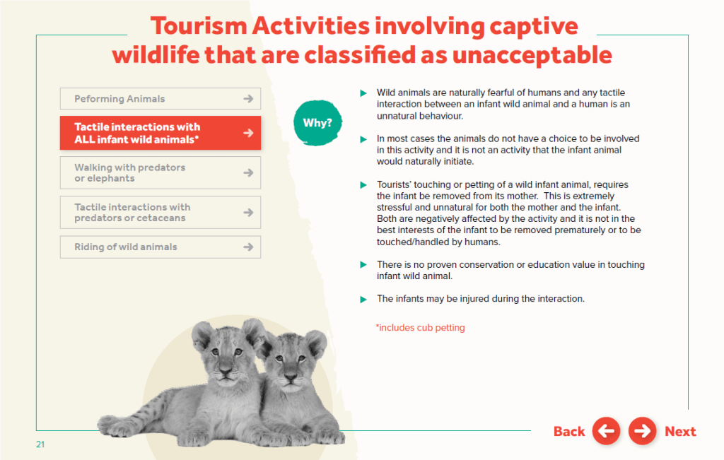 The tourism activities involving captive wildlife that are to be avoided, include performing animals, tactile interactions with ALL infant wild animals, walking with predators or elephants, tactile interactions with predators and cetaceans, and riding of wild animals. Eliminating these attractions from South Africa’s tourism offering will improve our international tourism reputation and competitive edge.